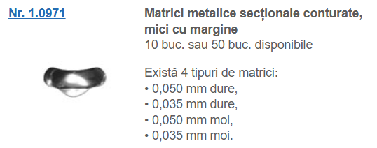 Matrice metalice conturate secționate, utilizate pentru restaurarea cavităților de clasa II la dinții posteriori, ajutând la refacerea conturului anatomic și a punctului de contact proximal. Perfect pentru restaurări cu materiale compozite, în special în zonele proximale ale molarilor și premolarilor, oferind o adaptare precisă la forma dintelui.